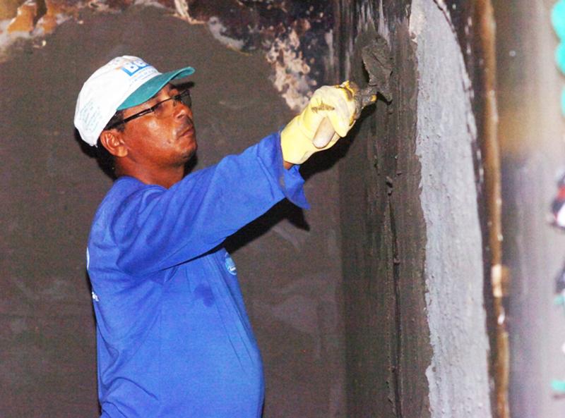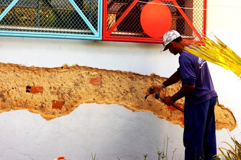 Ao constatar o grau de destruição das paredes incendiadas, o pedreiro José Domingos dos Santos trabalha incessantemente no reboco das áreas afofadas com a ação do fogo. A próxima etapa consiste na pintura e na restauração dos rodapés de madeira. "O estrago da parte elétrica se deu com a queima de reatores, lâmpadas, interruptores, tomadas e fiações. Além disso, estamos trocando o disjuntor tripolar que teve seus polos estourados após o curto circuito, daí a falta de energia em três salas, duas delas onde funcionam os berçários", ressaltou o eletricista Lisaldo Santos.