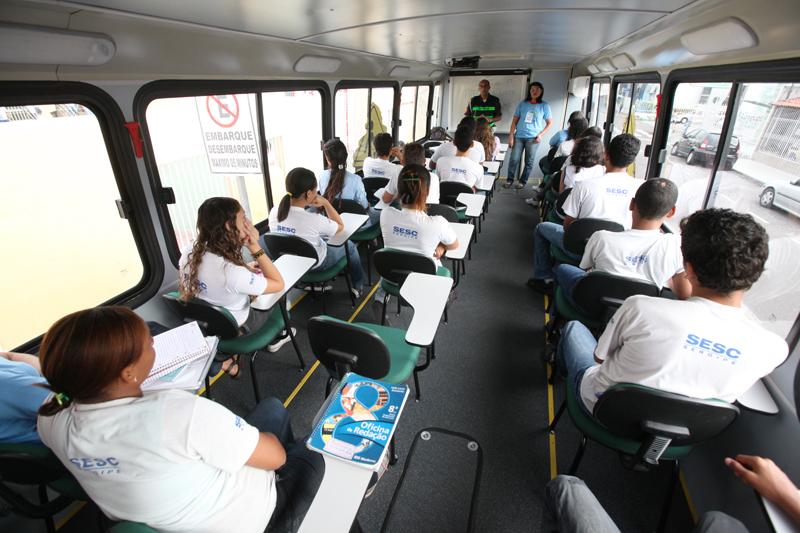 Em frente ao Sesc do bairro Siqueira Campos, um ônibus transformado em sala de aula, adaptado com trinta cadeiras, quadro e retroprojetor, agrupava alunos para uma aula de conscientização no trânsito , com dicas de comportamento e de segurança. O ônibus do Detran foi criado este ano com o objetivo de ir às escolas e passar para os estudantes os conhecimentos necessários do trânsito.