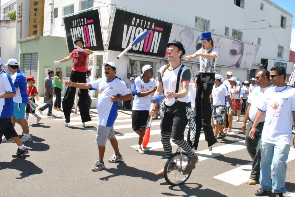 A caminhada foi animada por um mini-trio, pela presença de malabaristas sobre rodas e pernas-de pau e pela banda marcial do Colégio Estadual José Rollemberg Leite, unidade que trabalha com uma turma especial, segundo informou a sua diretora, Maria Lêda de Andrade Gomes.
