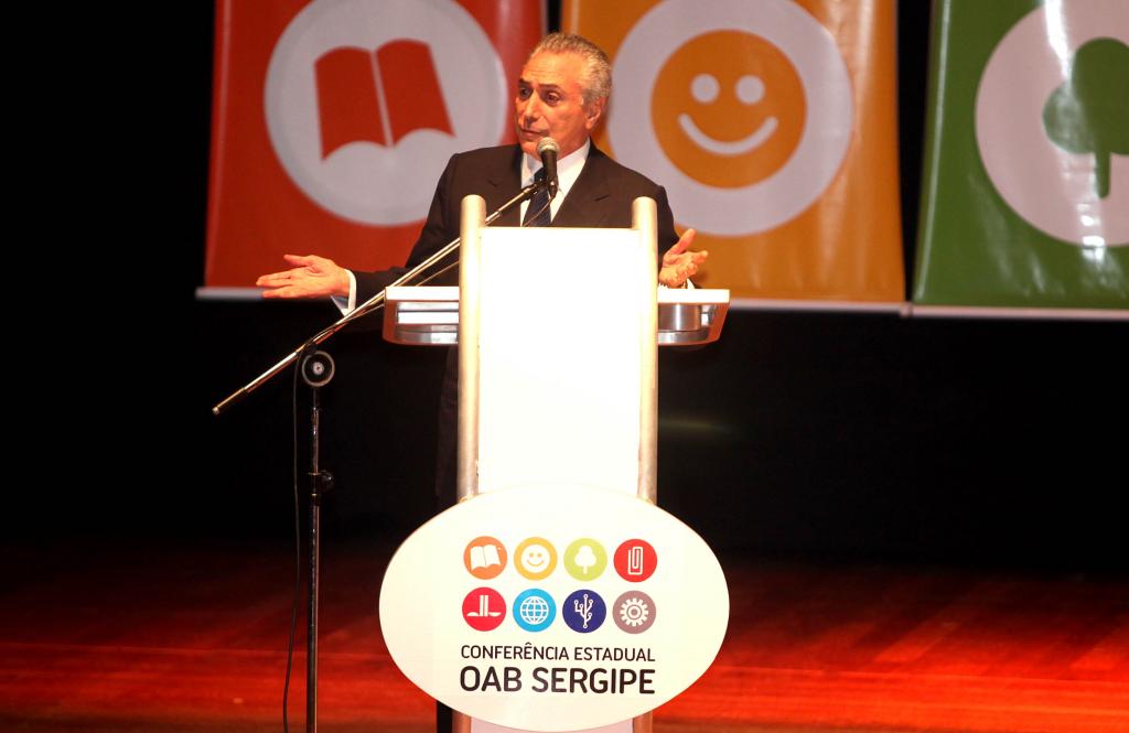 O presidente da República em exercício Michel Temer, visitou Aracaju nesta quinta-feira, 6. Advogado e doutor em Direito Constitucional pela PUC/SP, Temer veio participar da Conferência Estadual da Ordem dos Advogados do Brasil (OAB), onde proferiu palestra a estudantes e profissionais da área, que lotaram o auditório do Teatro Tobias Barreto. Ele falou sobre ‘Reforma Política e Partidária' e sobre ‘O Estado Social do Direito'.