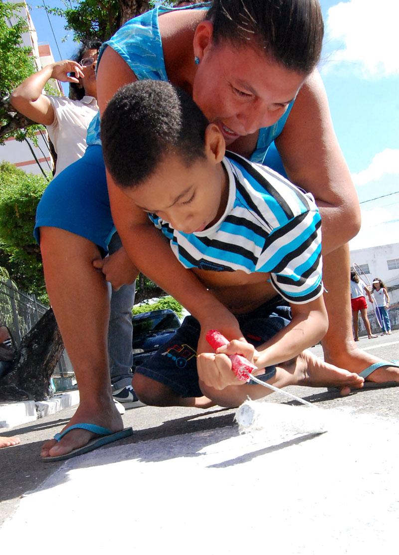 A escola de ensino fundamental atende também crianças com necessidades especias, que participaram da ação com alegria e entusiasmo. O aluno Mateus Almeida, cadeirante, de nove anos, foi um dos primeiros a pintar a faixa, com o auxilio da mãe, a dona de casa, Maria Cristina Almeida. "Esta atividade é maravilhosa, porque une recreação e aprendizado ao mesmo tempo. As crianças são o futuro e devem aprender sobre os direitos e os deveres de cada um no trânsito. Infelizmente os condutores não têm paciência de parar na faixa, principalmente para pessoas com necessidades especiais, vivencio isso diariamente com meu filho. Para dificultar mais a situação, ainda estacionam o carro na frente do rebaixamento feito nas calçadas para cadeirantes", conta Ana Cristina.