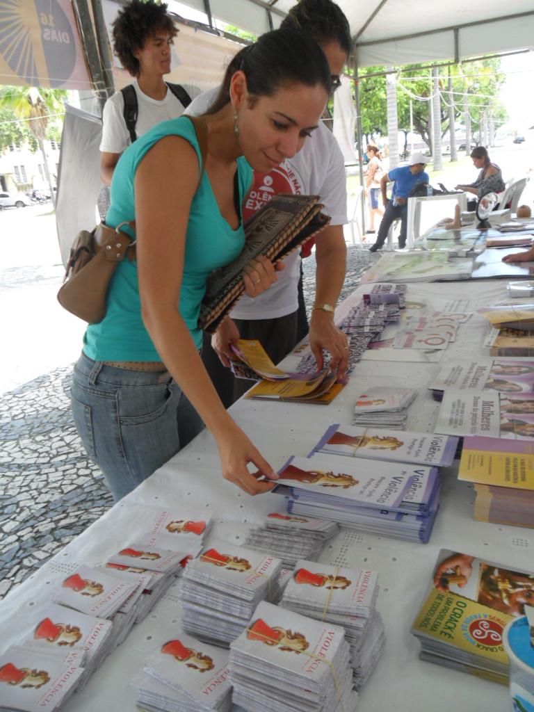 No estande montado pelo Programa Saúde da Mulher da SMS, em parceria com o Conselho Municipal de Direitos da Mulher, populares tiveram acesso a materiais informativos como a cartilha da III Conferência Estadual de Pólicas para Mulheres e o panfleto 'Violência- Procure Ajuda. Proteja-se!'.
