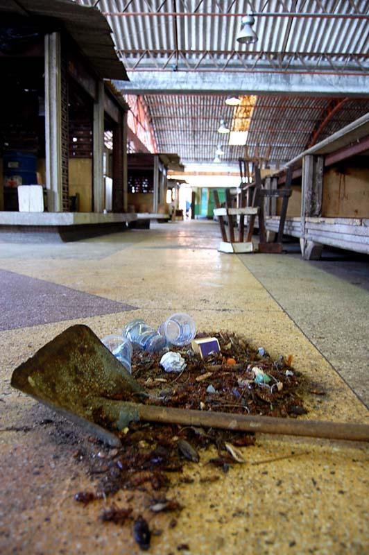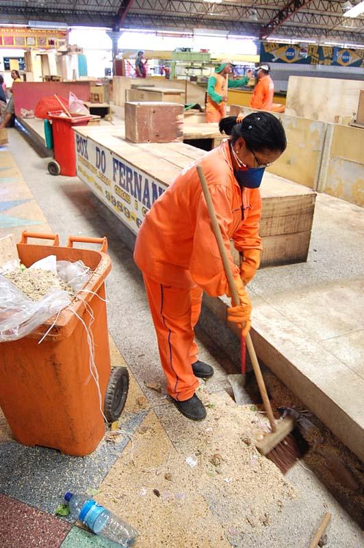 Com uma vassoura na mão e um contêiner de lixo ao lado, Selma Silva, uma das agentes de limpeza, percorre os corredores do mercado diariamente e reclama da sujeira deixada no local. "É um absurdo porque tem cesto de lixo em todo o lugar. O pessoal que vem aqui no mercado e os comerciantes também contribuem para isso", frisou a agente de limpeza.