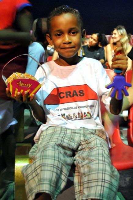 Cleiton Conceição dos Santos, 8 anos, do Cras Coqueiral, foi uma das crianças que participou de um número de mágica, demonstrando muita alegria e satisfação diante do publico. No final da apresentação cada criança foi contemplada com brindes, que os deixaram ainda mais alegres.
