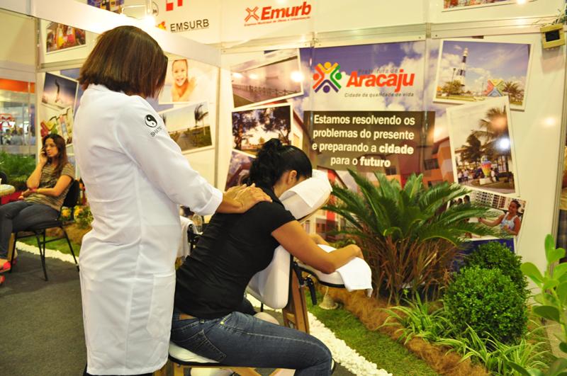 Quem visita o stand da Prefeitura de Aracaju, pode contar com um momento de relaxamento promovido por uma massoterapeuta da Fundat, que atende uma média de 15 pessoas por noite. A massagem, que tem duração média de 20 minutos, é uma demonstração dos benefícios desse tipo tratamento para a saúde, proporcionando o alívio do stress e a diminuição das dores musculares.