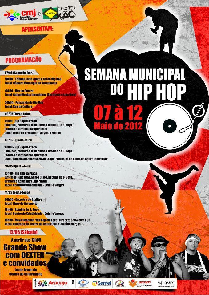 Realizada pela Prefeitura Municipal de Aracaju (PMA), por meio da Coordenadoria Municipal da Juventude, em parceria com a Nação Hip hop Brasil, a primeira Semana do Hip hop acontece de 7 a 12 de maio. Segundo o coordenador municipal da Juventude, Antonino Cardozo, esse é um marco para as comunidades aracajuanas que atuam na área.