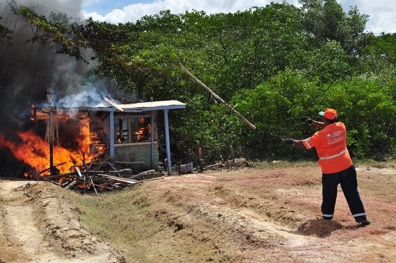 Construídos com material de restos de madeira e cobertos com pedaços de telhas de fibra e cimento, os barracos não ofereciam nenhuma segurança aos seus ocupantes. Todos os pertences recolhidos dentro deles foram levados para um depósito seguro e posteriormente seus donos poderão fazer o recolhimento.
