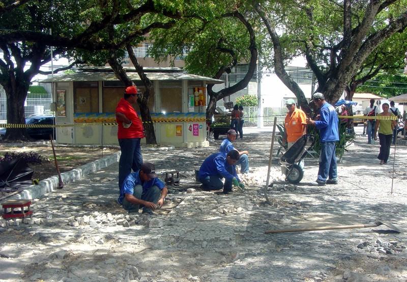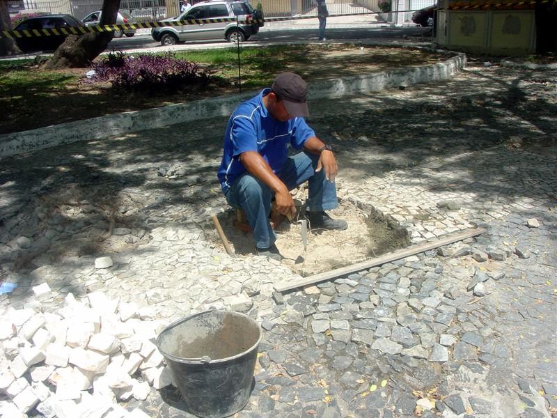 Com boa parte do pavimento já recuperado, a obra de assentamento das pedras portuguesas da praça Camerino, localizada no Centro da cidade, prossegue em ritmo normal. O trabalho desenvolvido pela equipe da Empresa Municipal de Obras e Urbanização (Emurb) consiste em colocar pedras novas e rejuntar as que estão soltas nos locais mais danificados, para oferecer conforto e segurança aos pedestres que transitam naquela área. O presidente da empresa, engenheiro Valmor Barbosa Bezerra, formou uma equipe exclusivamente para trabalhar na recuperação das praças que têm o pavimento revestido de pedras portuguesas. De acordo com Valmor, esse tipo de serviço é feito com bastante cuidado, uma vez que o assentamento das pedras portuguesas segue o traçado original para não descaracterizar o desenho tradicional. A reforma das praças é uma ação que a Emurb está desenvolvendo para melhorar a qualidade de vida das pessoas que freqüentam esses espaços de lazer. Essa preocupação com o bem-estar dos aracajuanos tem norteado a execução das obras da Prefeitura de Aracaju, que nos últimos anos urbanizou mais de 35 praças e áreas de lazer da cidade. Estudante do Colégio Tobias Barreto, Aline Castro falou que está adorando ver a Prefeitura recuperar o piso da praça Camerino. “Para nós, que estudamos nesta área, é um espaço valioso que deve ser bem tratado, porque é o único local que a gente tem para se encontrar com os colegas fora do Colégio. O prefeito está de parabéns pela iniciativa”, comemora Aline.