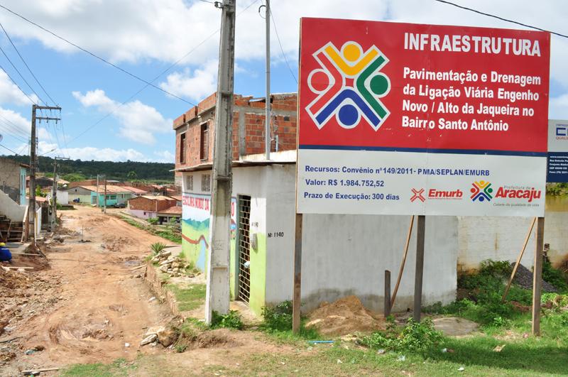 A Prefeitura de Aracaju, por meio da Empresa Municipal de Obras e Urbanização (Emurb), começou as obras de infraestrutura da ligação viária do Engenho Novo, na comunidade Alto da Jaqueira, no bairro Santo Antônio, Zona Norte da capital. Estão sendo investidos R$ 1.984,752,52 em recursos próprios e a previsão é de que as obras sejam concluídas em 300 dias.