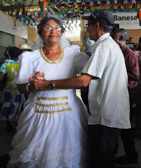 "Participo dessa festa há quatro anos e sempre faço questão de estar vestida de forma apropriada. A noiva é uma personagem importante dos festejos juninos, por isso escolhi me vestir assim", disse Lenita dos Santos, que faz parte do grupo de idosos Renascer, do bairro São Conrado, junto com seu parceiro, Oiama Souza.