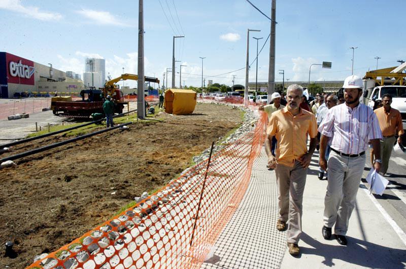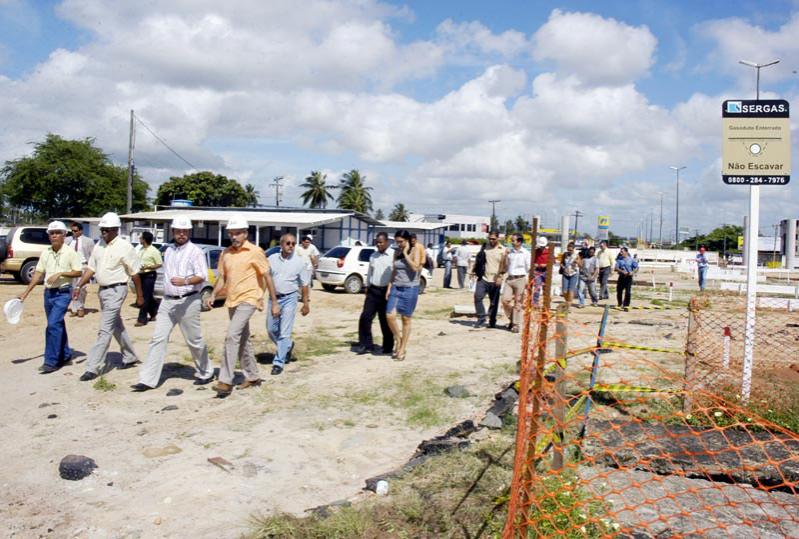 O prefeito de Aracaju, Edvaldo Nogueira, visitou esta manhã as obras do viaduto do DIA acompanhado da imprensa sergipana. Além de destacar a agilidade com que os trabalhos estão sendo conduzidos pela administração municipal, o prefeito mostrou aos jornalistas e radialistas presentes os espaços de que necessita nos terrenos da Codise e do Teatro Tobias Barreto (TTB) para acelerar a obra e entregá-la no prazo previsto de um ano. Do lado da Codise, apenas cinco metros de um terreno sem uso são precisos para criar o desvio de tráfego de veículos entre as avenidas Tancredo Neves e Heráclito Rolemberg, o que permitirá a elevação dos pilares que já estão prontos no subsolo. No TTB a prefeitura vai precisar de nove metros do estacionamento para criar um outro desvio e isso inclui também a calçada para pedestres. Vinte vagas serão eliminadas num primeiro momento, mas novas 70 serão construídas embaixo do viaduto. Estamos andando com a obra numa velocidade excelente e os terrenos já podiam ter sido liberados. O que estamos construindo aqui não é uma residência particular, mas uma grande obra que marcará a história de Aracaju e mudará a vida do povo para melhor, afirmou Edvaldo Nogueira. Deixei para mostrar os espaços que precisamos hoje porque não queria ser acusado de estar fazendo campanha política para o governador eleito. Continuo contando com a consciência cidadã do governador João Alves e sua equipe para liberar as áreas o quanto antes, acrescentou ele ao informar que desde fevereiro deste ano a prefeitura solicitou oficialmente as liberações dos dois terrenos (TTB e Codise). Os 4,5 metros do terreno do supermercado Extra já estão sendo utilizados para reorganizar a tubulação de gás e criar o desvio de veículos; os postes e a rede elétrica foram deslocados e estão prontos. Ao todo, seis pilares aparentes estão pronto, 228 estacas estão em seus devidos lugares; as modificações na tubulação de água e a construção de dois novos pilares externos estão em andamento. Os trabalhadores estão fazendo hoje a concretagem que sustentará a rampa do elevado que fica entre o Extra e o TTB e as escavações para a concretagem entre o terreno da Igreja Universal que já foi liberado e também está recebendo os novos dutos de gás, e da Codise estão adiantadas. A Deso, Sergás, Energipe e Telemar, que eram colocadas como os maiores problemas, acabaram não causando nenhum interferência na obra. Tomara que a solução para os terrenos que precisamos, que são coisa bem mais simples, saia logo, falou o prefeito. O novo viaduto do DIA vai desafogar o intenso tráfego de veículos e organizar o trânsito entre as avenidas Adélia Franco e Heráclito Rollemberg, que ligam a cidade de norte a sul, e a avenida Tancredo Neves, que passa pela interseção delas, ligando a entrada da capital à avenida Beira Mar. Bairros populosos como o Orlando Dantas, Santa Maria, Atalaia, conjunto Augusto Franco e a zona de expansão da Aruana, que inclui milhares de novas famílias moradoras do Programa de Arrendamento Residencial (PAR), serão extremamente beneficiadas. Participaram da visita, os secretários municipais Silvio Santos (Governo), Oliveira Junior (Finanças), Rômulo Rodrigues (Orçamento Participativo), Waneska Cipriano (Comunicação), além do superintendente da SMTT, Bosco Mendonça, do presidente da Emurb, Valmor Bezerra, do presidente da Fundat, Edson Caetano, e do chefe de Gabinete, Bosco Rolemberg.