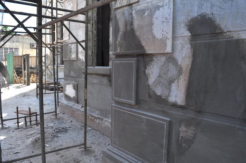 Na restauração, as fachadas estão sendo lavadas com detergente e cloro, antes da reconstituição dos panos de parede. As colunas estão sendo niveladas, havendo preparação para reintegração cromática. Está sendo feito o processo de dessalinização da superfície original do roda-teto da parte interna para um posterior nivelamento e restabelecimento de cores.