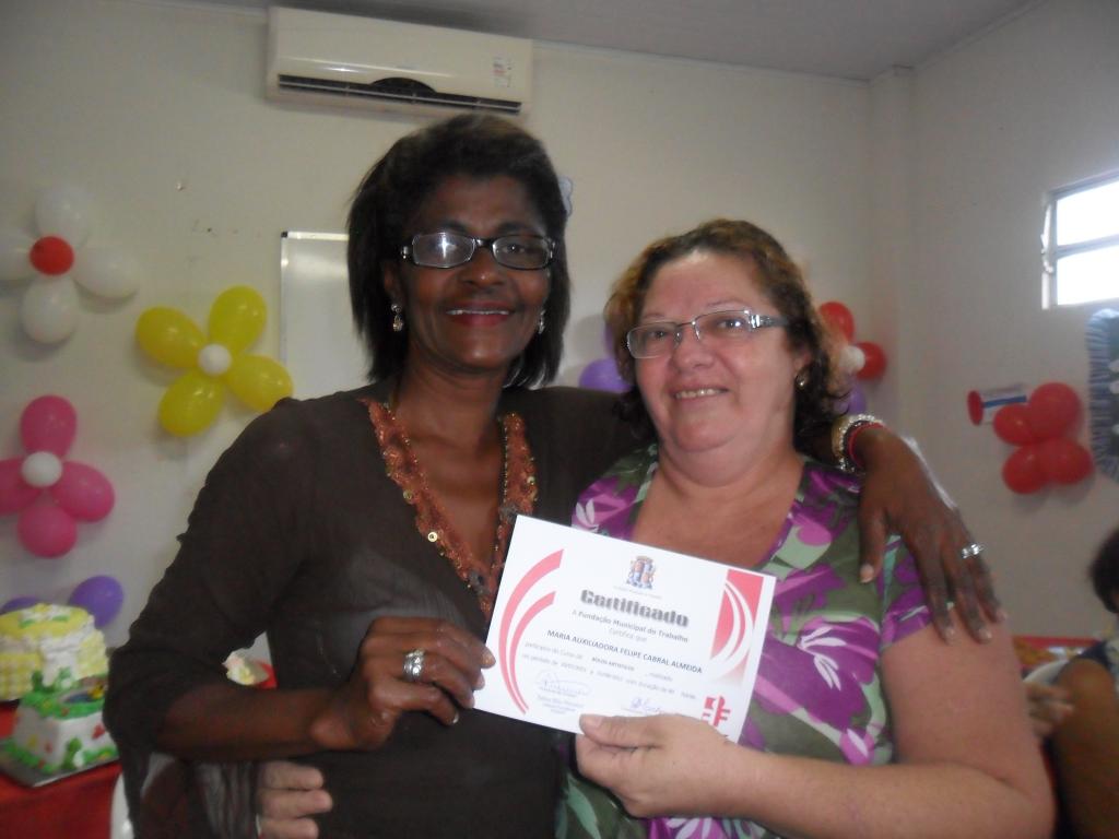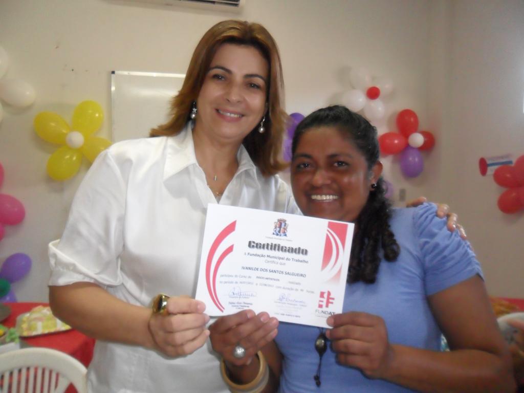 "É um exemplo de superação e mais uma vez comprovamos que o caminho é qualificação profissional para a geração de trabalho e renda e, consequentemente, melhor qualidade de vida". A expressão é da presidente da Fundação Municipal do Trabalho (Fundat), Telma Rios Pimentel, durante a solenidade de entrega de certificados para 40 mulheres que concluíram os cursos de doces e salgados e bolos artísticos, ao se referir ao exemplo da dona de casa Michele dos Santos, 29 anos, que após a sua persistência com relação a capacitação profissional, em cursos da fundação, passou a ter renda, além de ter adquirido a sua casa própria. Os cursos foram realizados na Unidade de Qualificação e Produção Paulo da Conceição, localizada no bairro Porto D'antas.