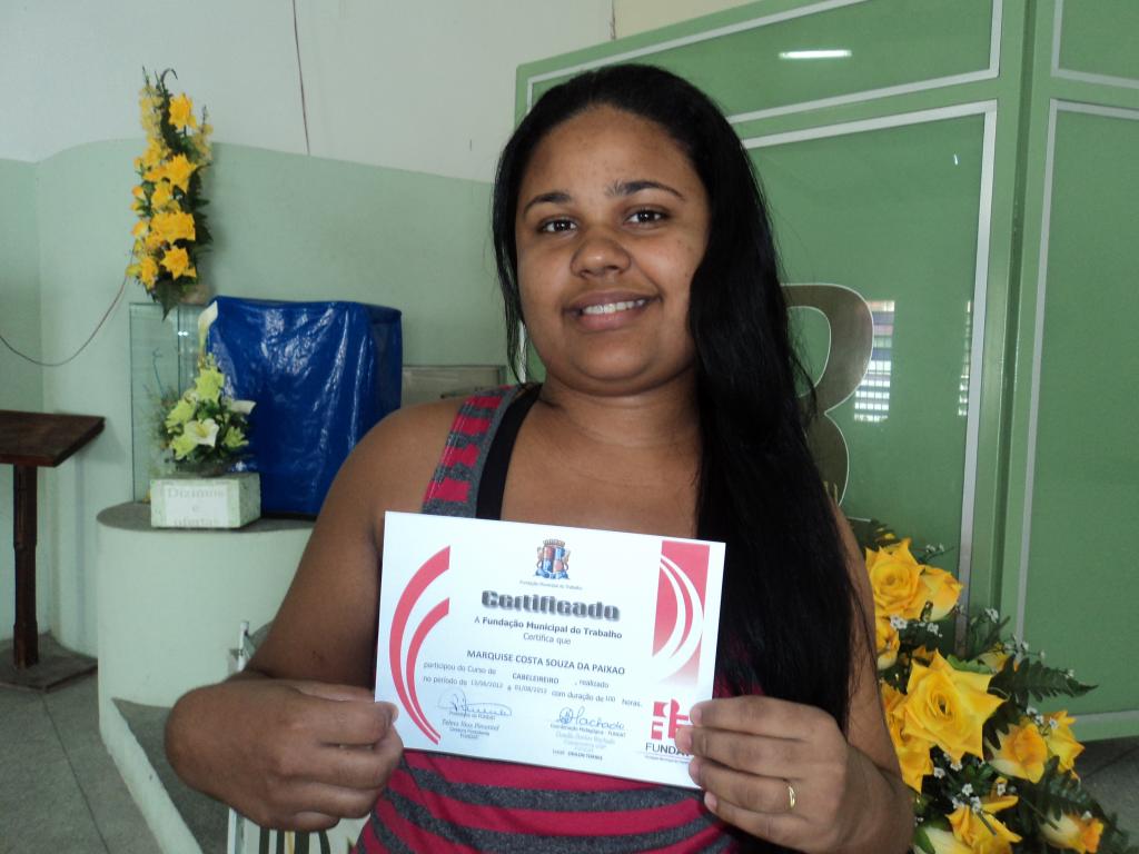 A aluna teve uma frequência de 100%, apesar de percorrer quilômetros a pé diante da falta de dinheiro para a passagem de ônibus. A determinação foi tão grande que em apenas 45 dias montou o seu salão e já está obtendo renda. Além da entrega dos certificados do curso de cabeleireiro, também foram disponibilizados os diplomas para concludentes dos cursos de doces e salgados e corte e costura, totalizando 75 pessoas qualificadas.