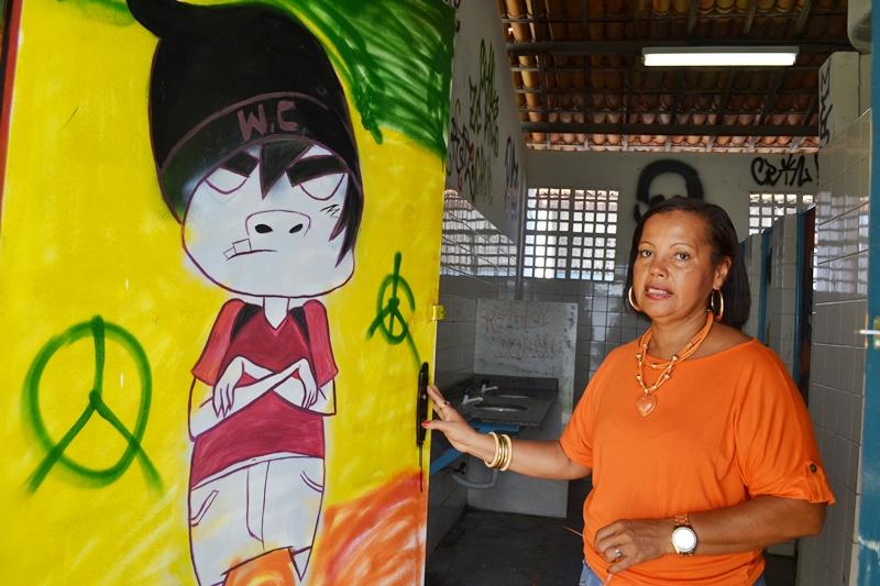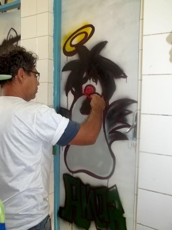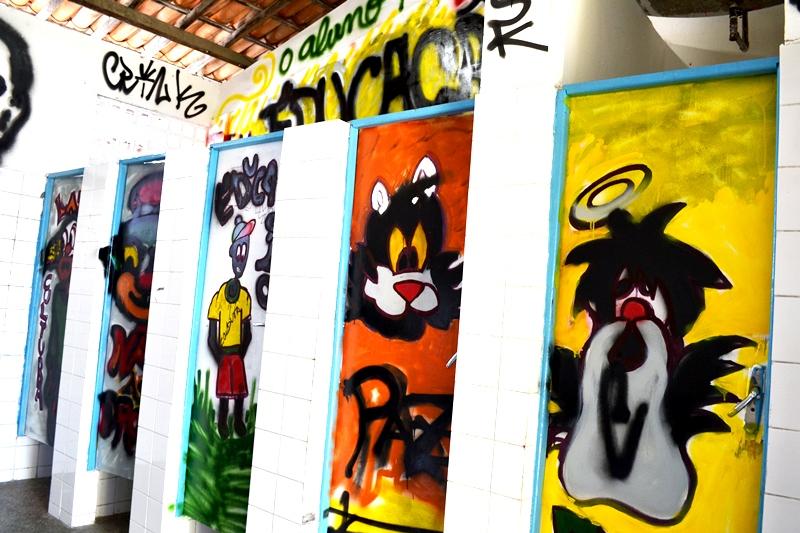 Durante dois dias, os alunos da Escola Municipal de Ensino Fundamental Alcebíades Melo participaram de uma atividade diferenciada. Supervisionados pelo artista plástico Bené Santana, os estudantes transformaram as paredes e portas dos banheiros da instituição em uma verdadeira obra de arte.