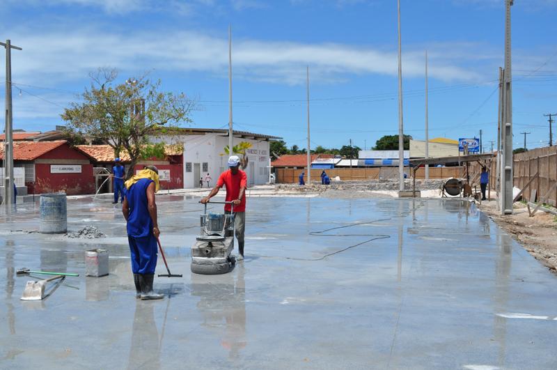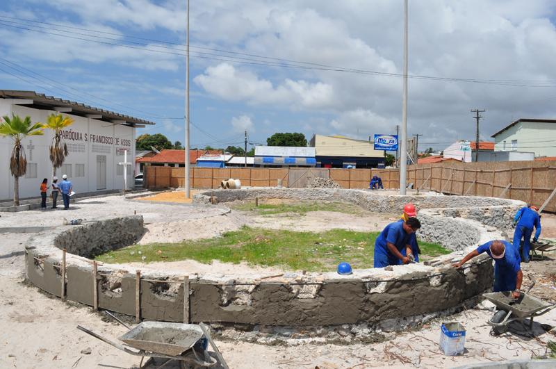 Esta semana equipes da empresa trabalham no polimento em granito da quadra poliesportiva, que em breve deverá ser coberta com tela de proteção. Os bancos do parque também estão em fase de acabamento assim como a estrutura onde ficará a bomba de água, utilizada na aguagem das plantas. Nas próximas semanas, deverá ser iniciada a concretagem dos passeios e a implantação dos aparelhos do parque infantil.