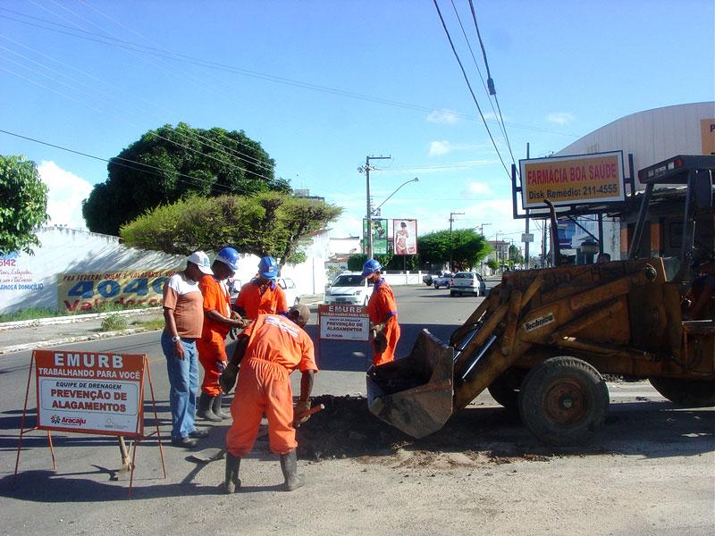 Desde o ano passado, a Prefeitura de Aracaju, por meio da Empresa Municipal de Obras e Urbanização (Emurb), está desenvolvendo um trabalho intensivo para evitar possíveis alagamentos na cidade, em função das chuvas que são esperadas para os próximos meses. As ações preventivas da Prefeitura são concentradas na recuperação e implantação de galerias de drenagem de ruas, limpeza e desobstrução de rede tubular, poços de visita e bocas de lobo. Segundo o prefeito Edvaldo Nogueira, a importância desse tipo de serviço é evitar que o período chuvoso cause maiores transtornos à população com o escoamento das águas pluviais. Como temos de nos prevenir para possíveis índices pluviométricos altos, estamos colocando a Emurb em estado de alerta e realizando esses serviços preventivos. A prevenção evita que tenhamos transtornos de última hora, acrescenta. A Emurb produziu um mapa onde foram identificados os pontos críticos de alagamentos em toda a cidade. Com esse diagnóstico, foi possível elaborar um cronograma de trabalho para que as equipes de drenagem executassem obras e serviços nesses locais. Um efetivo de aproximadamente 80 homens e dois caminhões equipados com sistemas de desobstrução opera diariamente em vários pontos da cidade. Um dos caminhões é equipado com sistema pneumático de alta pressão que, através de jatos, elimina a maioria dos detritos que obstruem a passagem da água. O outro caminhão dispõe de um potente sistema de sucção que, aliado ao trabalho realizado pelos operários, desentope as grelhas, tubulações e poços de visita que compõem o sistema de drenagem da capital. Diversas obras e serviços já foram realizados nesse período e outros estão em execução. A Emurb já conseguiu eliminar pontos de alagamento em diversos bairros da capital, a exemplo da avenida Ivo do Prado, ao lado da praça Ignácio Barbosa, onde foi implantada uma nova tubulação de drenagem. Dos pontos mapeados na cidade, as equipes da empresa já atuaram nos últimos 30 dias nas ruas Acre (Siqueira Campos), Siriri (Centro) e Rafael de Aguiar (Pereira Lobo) e nas avenidas Visconde de Maracaju (Santos Dumont) e Oceânica (Atalaia) . Estão programadas ações em diversas outras localidades. Os alagamentos ocorrem com maior freqüência em locais perto do Centro da cidade e das feiras livres. O presidente da Emurb, engenheiro Valmor Bezerra, pede à população para evitar jogar lixo nas ruas, uma vez que esse é um dos fatores que mais contribuem para a obstrução dos canais e bocas de lobo. O nosso grande objetivo é contar com a compreensão de todos os cidadãos para que colaborem com o bom funcionamento da drenagem, evitando descartar lixo incorretamente. É inadmissível que continuemos a retirar móveis velhos, sofás, pneus, animais mortos, dentre outros objetos dos sistemas de drenagem, já que contamos com a coleta regular de lixo em toda a cidade. Os cidadãos devem ser os nossos maiores fiscais, enfatiza o presidente da Emurb.
