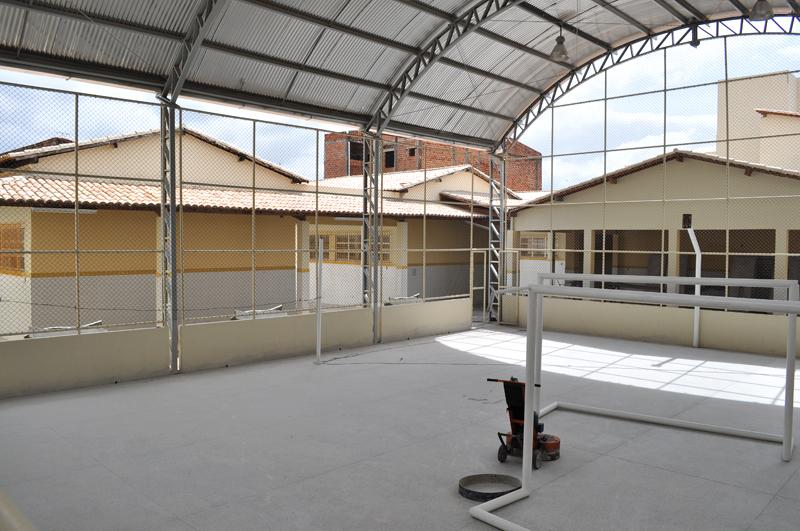 Em fase de conclusão, a obra já está praticamente finalizada, faltando apenas terminar a pintura da fachada, o acabamento dos banheiros, com a colocação de vasos, pias e torneiras, a instalação do alambrado da quadra poliesportiva e da tabela de basquete e, por fim, a ligação do elevador.