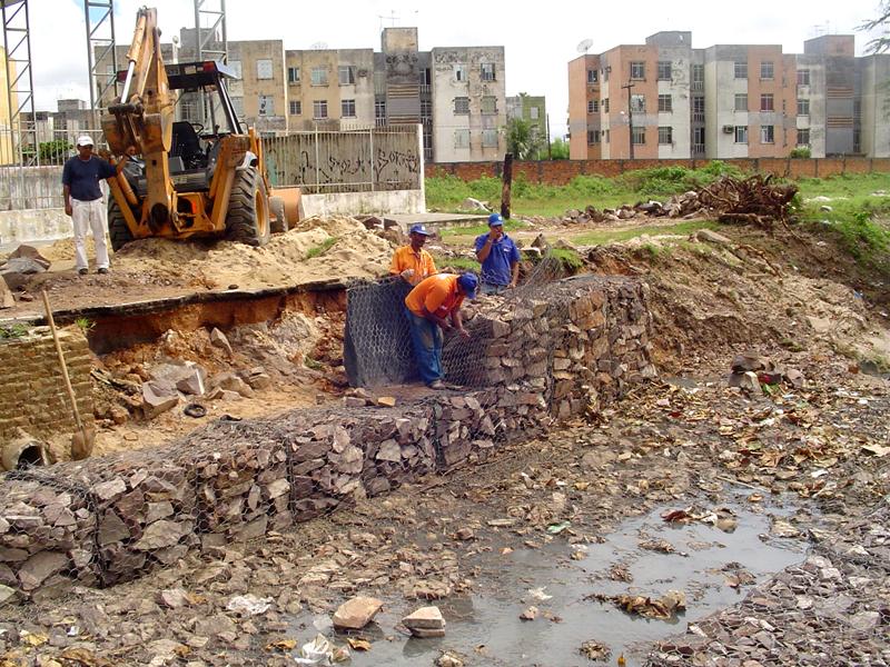A Prefeitura de Aracaju, por meio da Empresa Municipal de Obras e Urbanização (Emurb), tem atendido às demandas da cidade relacionadas à recuperação das vias públicas, implantação e manutenção da rede de drenagem, pavimentação e tantos outros serviços de infra-estrutura dos quais a capital necessita. Atualmente, equipes da empresa recuperam a parede de contenção do canal no final da avenida Caçula Barreto, antiga Canal 3, localizada no conjunto Augusto Franco, bairro Farolândia. A obra consiste na substituição da antiga estrutura de concreto pelo gabião, um sistema construtivo composto por manta geotástil, tela metálica e pedras, que tem a função de conter as laterais do canal. Parte da parede do canal sofreu erosão ao longo dos anos e, com isso, a estrutura cedeu numa extensão de aproximadamente 40 metros. Essa nova estrutura vai garantir mais estabilidade e vida útil à macro-drenagem do local e melhorar o funcionamento da drenagem que faz o lançamento das águas da chuva no canal. As equipes de manutenção da Emurb têm atuado em todos os bairros da cidade, atendendo às demandas relacionadas à recuperação dos espaços públicos. Estamos atentos a essas necessidades e procuramos atendê-las com a maior brevidade. Tão logo tomamos conhecimento da erosão nesse pequeno trecho do canal, programamos a sua recuperação. Temos priorizado as obras e os serviços que promovam a segurança e a qualidade de vida dos cidadãos de Aracaju, que é uma orientação do prefeito Edvaldo Nogueira, informa Valmor Bezerra.