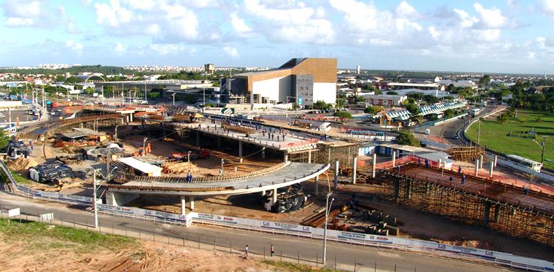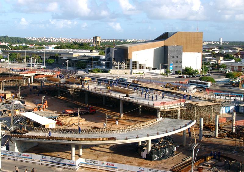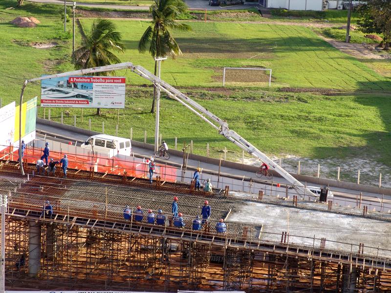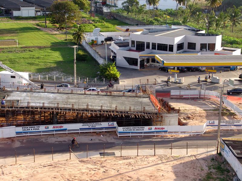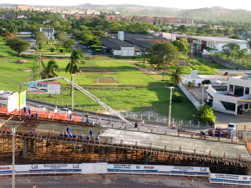 A maior e mais importante obra urbana dos últimos anos na cidade de Aracaju ganha novos contornos no bairro Ignácio Barbosa. A cada dia, a imponente estrutura do viaduto sobre a rótula do Distrito Industrial de Aracaju (DIA) exibe a sua arquitetura moderna, executada com a mais avançada tecnologia construtiva. As equipes formadas por cerca de 210 operários executam diversas atividades de forma simultânea. Cada equipe é responsável por uma atividade: concreto, ferragem, fôrmas e escoramento. É um serviço sincronizado, planejado e marcado por etapas. Cada equipe tem o dia de entrega, pois um serviço depende do outro. Esta semana dois trechos da estrutura do viaduto foram concretados. Na segunda-feira (13), a estrutura principal da obra recebeu 250 metros cúbicos de concreto. O serviço de concretagem foi feito em um trecho de 43,50 metros de extensão. Hoje, quinta-feira, uma das frentes de trabalho executa a concretagem da rampa de acesso em frente ao posto de gasolina, onde serão aplicados 480 metros cúbicos de concreto numa extensão de 77 metros. Finalizada esta etapa, a obra passa para 170 metros do seu total já concluídos, com um volume de 1.620 metros cúbicos de concreto consumidos. Todas as etapas de construção do viaduto são cuidadosamente planejadas para que sejam reduzidos, ao mínimo, os desconfortos para a população. Temos obtido muitos avanços na obra nas últimas semanas, cumprindo rigorosamente os prazos estabelecidos para que o prefeito Edvaldo Nogueira possa entregar esta magnífica obra até no final do ano, informa o presidente da Empresa Municipal de Obras e Urbanização (Emurb), engenheiro Valmor Barbosa Bezerra. O viaduto terá 347,5 metros de extensão, vai desafogar o trânsito e minimizar os engarrafamentos no DIA, especialmente em horários de pico, quando cerca de 90 carros passam por minuto. A construção do viaduto tornou-se fundamental pelo grande fluxo de ônibus causado pelo terminal de integração do DIA e a movimentação de carros comuns. Serão bastante beneficiados com a obra, em especial bairros populosos como o Orlando Dantas, Santa Maria, Atalaia, o conjunto Augusto Franco e a zona de expansão da Aruana, que inclui milhares de novas famílias moradoras do Programa de Arrendamento Residencial (PAR).