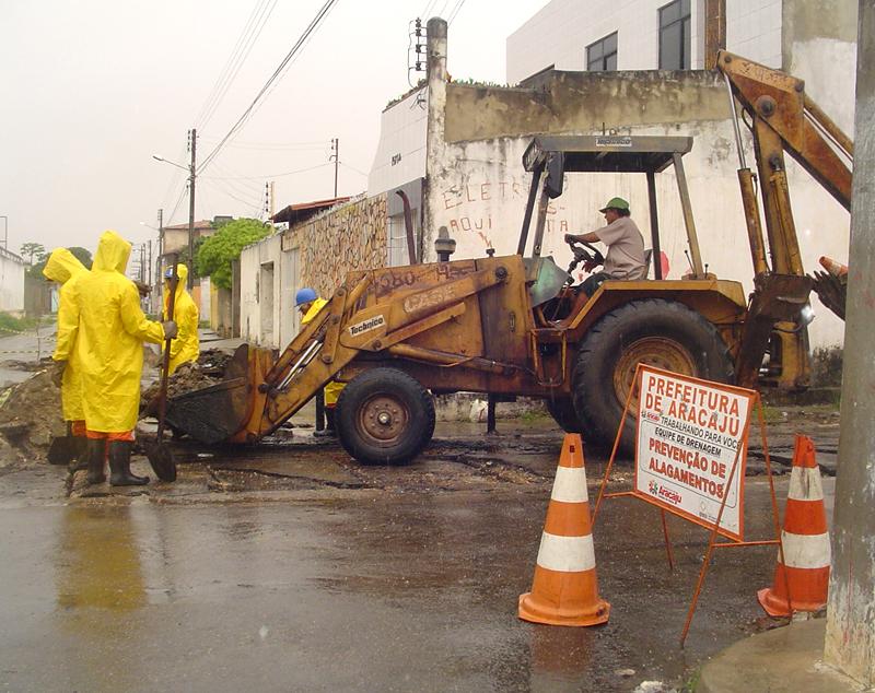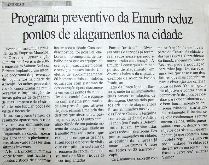 A cada inverno, os incômodos causados por pontos de alagamentos na cidade de Aracaju vêm sendo reduzidos, gerando satisfação na população local e reconhecimento, também, pela mídia sergipana. Desde que assumiu a presidência da Empresa Municipal de Obras e Urbanização (Emurb), em fevereiro de 2006, o engenheiro Valmor Barbosa Bezerra implantou um intensivo programa de prevenção de alagamentos na capital. As ações preventivas são concentradas na recuperação e implantação de novas galerias de drenagem de ruas, limpeza e desobstrução de rede tubular, poços de visita e bocas de lobo. Em pouco tempo, os resultados apareceram, com a redução significativa de pontos de alagamentos, apesar dos altos índices pluviométricos observados nesses dois últimos invernos. A Emurb produziu um mapa onde foram identificados os pontos críticos de alagamentos em toda a cidade. Com esse diagnóstico, foi possível elaborar um cronograma de trabalho para que as equipes de drenagem executassem obras e serviços nesses locais. Um efetivo de aproximadamente 80 homens e dois caminhões equipados com sistemas de desobstrução opera diariamente em vários pontos da cidade. Um dos caminhões é equipado com sistema pneumático de alta pressão que, através de jatos, elimina a maioria dos detritos que obstruem a passagem da água. O outro caminhão dispõe de um potente sistema de sucção que, aliado ao trabalho realizado pelos operários, desentope as grelhas, tubulações e poços de visita que compõem o sistema de drenagem da capital, que possui mais de 50 mil bocas de lobo implantadas. Diversas obras e serviços já foram realizados nesse período e outros estão em execução. A Emurb já conseguiu eliminar pontos de alagamento em diversos bairros da capital, a exemplo da avenida Ivo do Prado, ao lado da praça Ignácio Barbosa, onde foram implantadas duas novas tubulações de drenagem. Outros dois pontos críticos de alagamentos foram eliminados nas avenidas Pedro Calazans (esquina com a rua Estância) e Adélia Franco (em frente à Dehop), onde foram implantadas novas redes de drenagem. Dos pontos mapeados na cidade, as equipes da empresa já atuaram nos últimos 18 meses em todos os 38 bairros da capital. É gratificante observar o reconhecimento da população e da imprensa, como a matéria do jornal Correio de Sergipe, do trabalho desenvolvido pela Emurb. Isso nos dá um incentivo maior e a certeza de que a administração do prefeito Edvaldo Nogueira tem correspondido aos anseios dos aracajuanos. Não temos medido esforços para minimizar os problemas causados pelos pontos de alagamentos na cidade, informa o presidente da Emurb, engenheiro Valmor Barbosa Bezerra. De acordo com ele, os alagamentos ocorrem com maior freqüência em locais perto do Centro da cidade e das feiras livres. Valmor pede à população para evitar jogar lixo nas ruas, uma vez que esse é um dos fatores que mais contribuem para a obstrução dos canais e bocas de lobo. O nosso grande objetivo é contar com a compreensão de todos os cidadãos para que colaborem com o bom funcionamento da drenagem, evitando descartar lixo incorretamente. É inadmissível que continuemos a retirar móveis velhos, sofás, pneus, animais mortos, dentre outros objetos dos sistemas de drenagem, já que contamos com a coleta regular de lixo em toda a cidade. Os cidadãos devem ser os nossos maiores fiscais e parceiros, enfatiza Valmor.