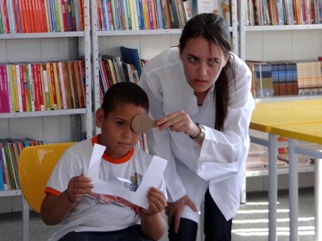 Durante a manhã, mais de 500 alunos do ensino fundamental com idades de 4 a 6 anos assistiram ao Curta SUS com a exibição de filme sobre alimentação saudável e também receberam cuidados em saúde como exames oftalmológicos e nutricionais. Petrônio Gomes conversou com as crianças e professores e destacou que os exames disponibilizados permitem a detecção de doenças da visão, audição e até mesmo abdominais, como é o caso das verminoses que são comuns em crianças.