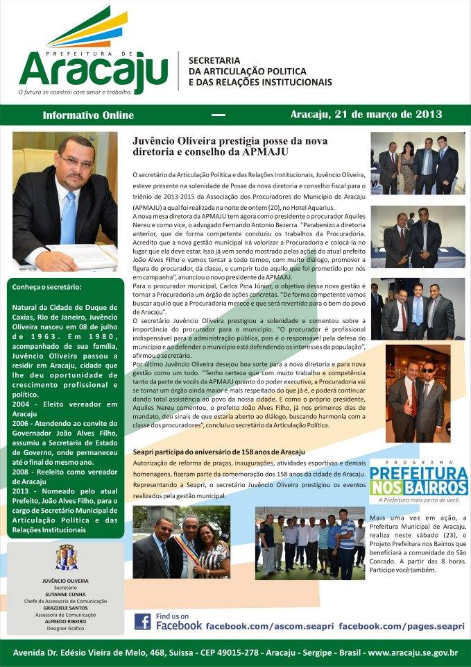 A Secretaria da Articulação Política e das Relações Institucionais (Seapri) inova na divulgação de seus trabalhos através da criação de um Informativo Online. Enviado semanalmente para toda imprensa sergipana, colaboradores da gestão municipal e demais cidadãos, o Informativo conta com um resumo das ações desenvolvidas pela Secretaria.