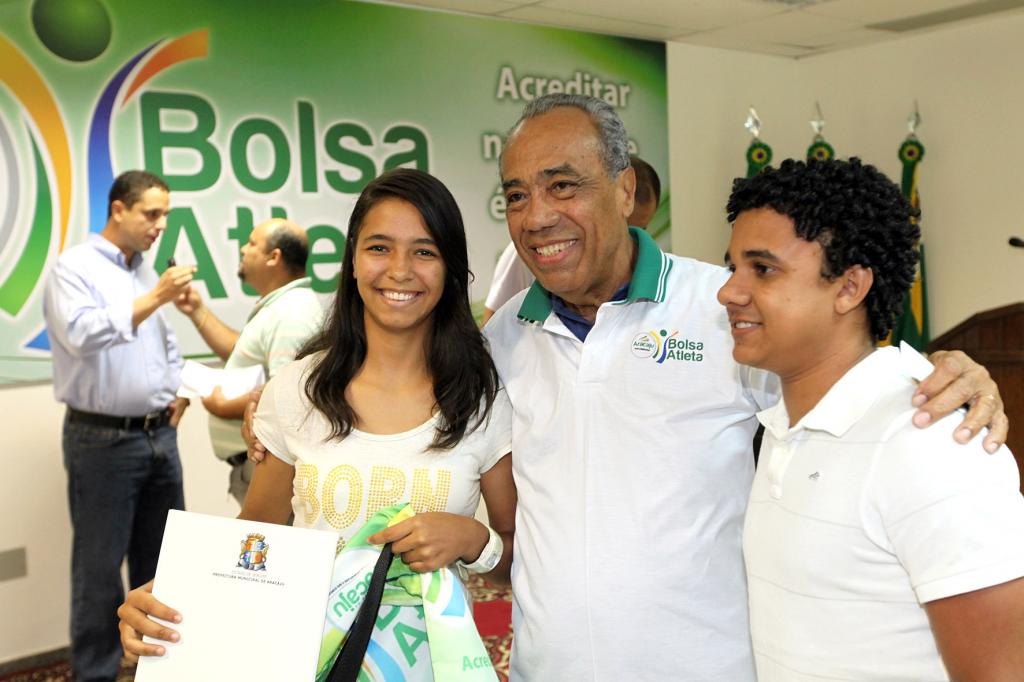 O auditório do Centro Administrativo Prefeito Aloísio Campos se transformou num imenso pódio durante a noite desta terça-feira, dia 16, no lançamento oficial do Bolsa Atleta 2013. Os 80 atletas contemplados receberam os kits de fardamento do programa - contendo camisas, bolsa de viagem, mochila e boné - e os contratos assinados que garantem o benefício até dezembro deste ano.