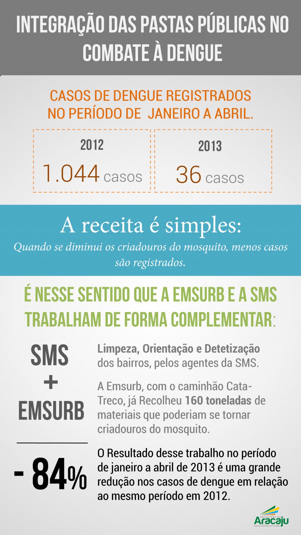 As pastas da PMA trabalham de maneira integrada, com a certeza de que cada papel é necessário para o sucesso do todo. A prova disso está em dados. De janeiro a abril deste ano, de acordo com a Secretaria Municipal de Saúde (SMS), 36 casos de dengue foram confirmados, enquanto em 2012, no mesmo período, a contabilidade atingiu os números alarmantes de 1.044 casos. Para Taíse Cavalcante, coordenadora do Programa de Combate à Dengue, a iniciativa do Caminhão Cata-Treco de fato contribui para o sucesso do Município no combate à dengue. "Tanto a Emsurb quanto a SMS, ainda que cada um em seu espaço, realiza um trabalho conjunto em prol do cidadão aracajuano. Logo, o recolhimento de materiais possíveis criadouros do mosquito da dengue é providencial", afirma a coordenadora.