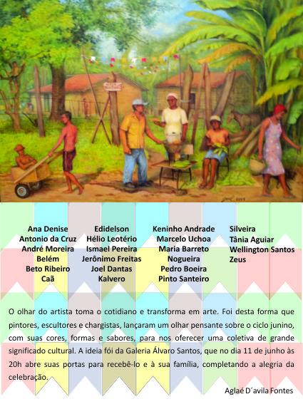 O clima de festejos também invade a Galeria de Artes Álvaro Santos, onde acontecerá, de 11 a 30 de junho, a Exposição Coletiva Junina 2013. Contando com a participação de 22 artistas da terra, que estarão expondo esculturas, desenhos, óleo sobre tela e pano, na noite de abertura os convidados serão recepcionados com comidas típicas, trio pé-de-serra e apresentação de quadrilha junina.