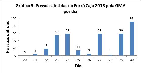 A 20ª edição do Forró Caju teve como marca a tranquilidade garantida graças ao trabalho de segurança prestado pela Guarda Municipal de Aracaju (GMA). Tudo pode ser comprovado pelos números contabilizados durante as 11 noites do evento, em que não se registrou nenhum homicídio e/ou ocorrência de elevado grau de complexidade. As estatísticas revelam o êxito da GMA, que efetuou a prisão de 33 indivíduos, resultando na lavratura de 20 procedimentos policiais. Foram custodiadas provisoriamente 334 pessoas, as quais se envolveram em ocorrências de menor gravidade, sem definição de autoria.