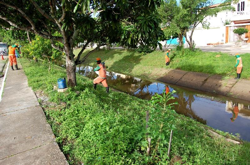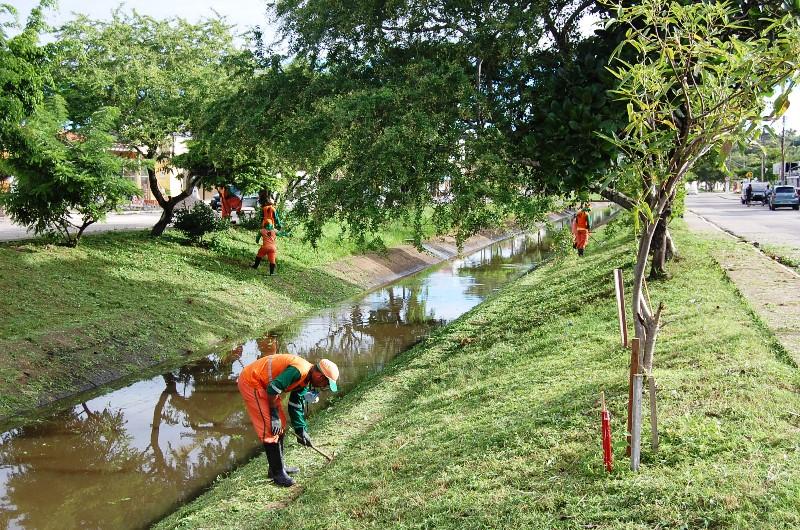 Onze trabalhadores, munidos de vassouras de aço, enxadas, carrinhos-de-mão, vassouras e pás, começaram os trabalhos no entorno do canal no início da avenida Cel. Sizino da Rocha com a rua Rio Poxim. Um caminhão tipo caçamba recolhe o resíduo do serviço.