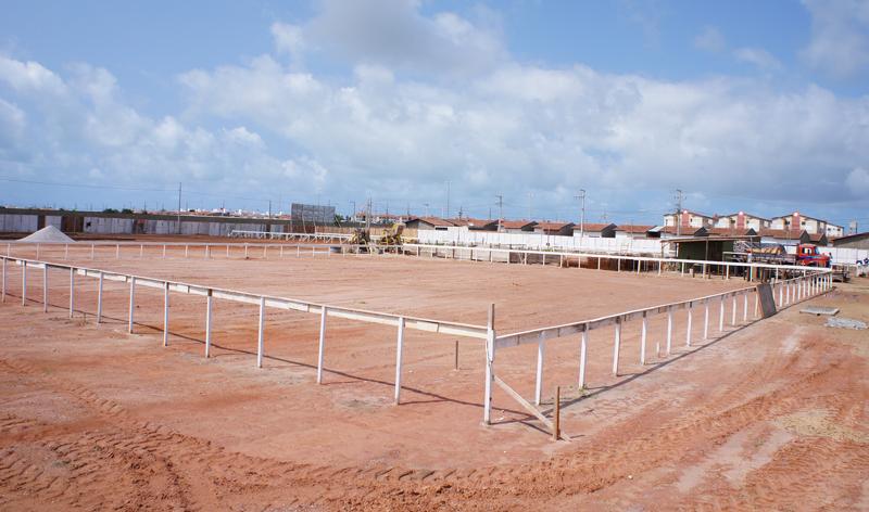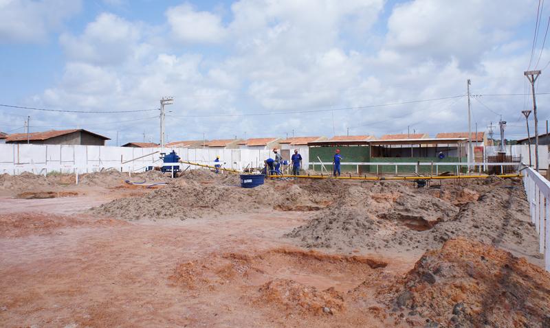 Esta semana cerca de dez profissionais estão trabalhando na execução das sapatas, drenagem da quadra de areia, marcação do ginásio e a topografia do espaço criança e da casa de bomba.