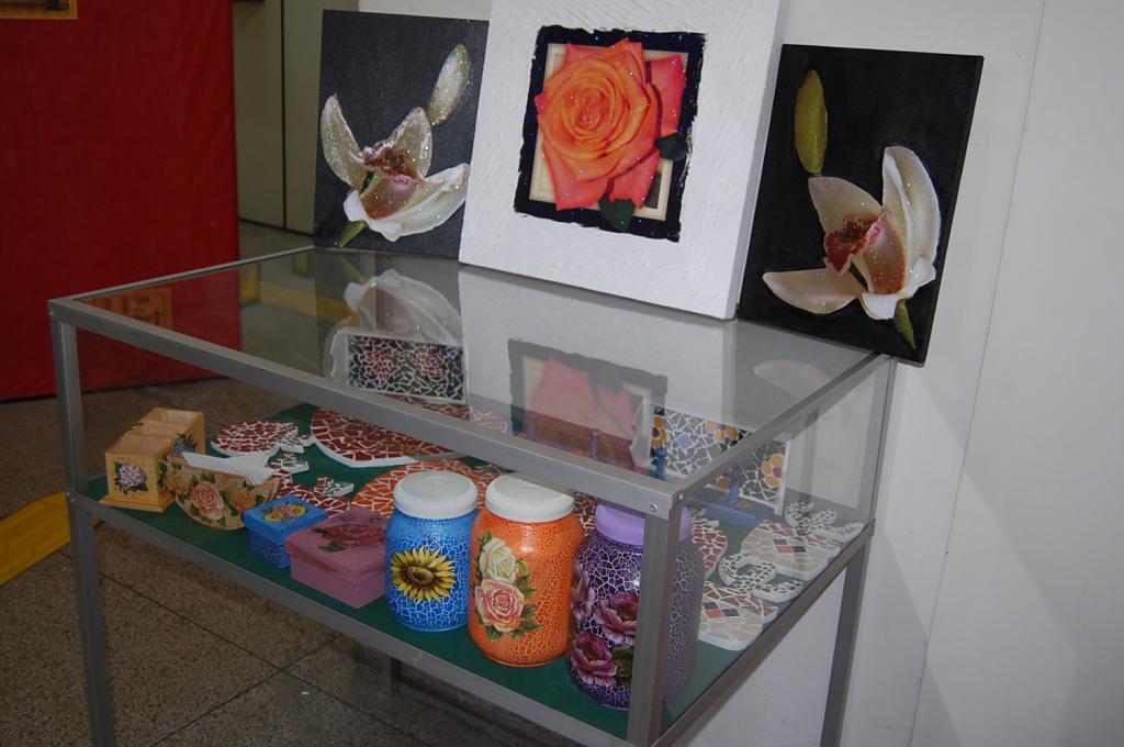Reunindo mais de 20 peças, a artesã, Lindalva Amâncio Gama, traz uma variedade incrível de objetos que podem ser aplicados à técnica do mosaico. "Esta aplicação de pedacinhos de vidros, espelhos e cacos de azulejo podem ser coladas em cima de qualquer superfície formando um quebra-cabeça desigual e uniforme", explica.