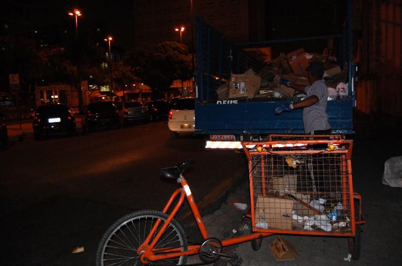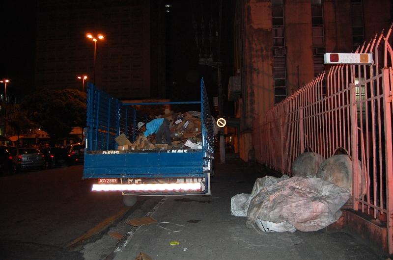 No período da noite integrantes da Coores executam o serviço de recolhimento de materiais recicláveis descartados pelas lojas no Centro da capital.