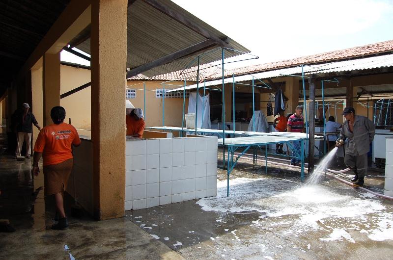 Os agentes de limpeza realizam a lavagem dos corredores do tradicional mercado com água e sabão e finalizam a higienização com produtos desinfetantes. Um caminhão-pipa de 15 mil litros também auxilia a ação.