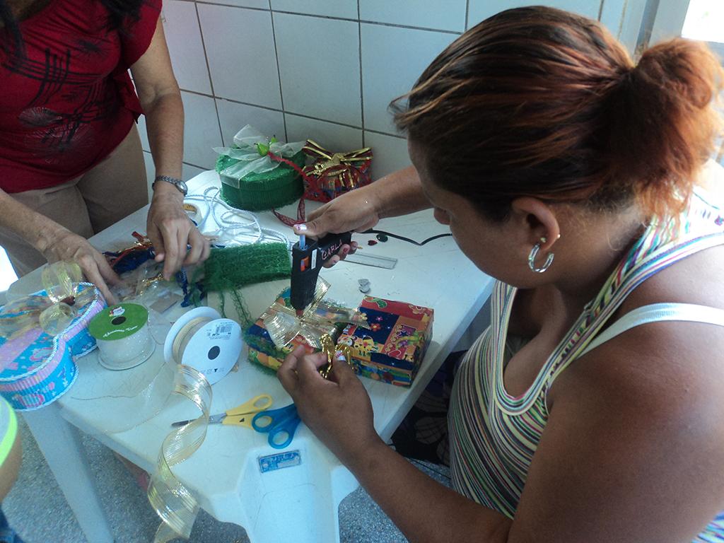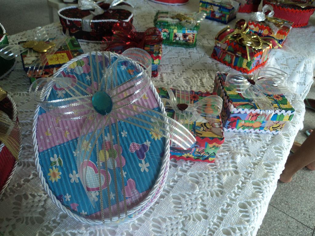 Para o curso de Caixa de Presente, realizado no CRAS do bairro Soledade, a instrutora Ionizete Ferreira da Conceição estimulou os participantes a organizarem suas confecções de acordo com o gasto despendido para cada produto, sem se esquecer de relacionar os objetos com a proximidade de datas comemorativas.