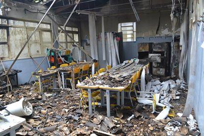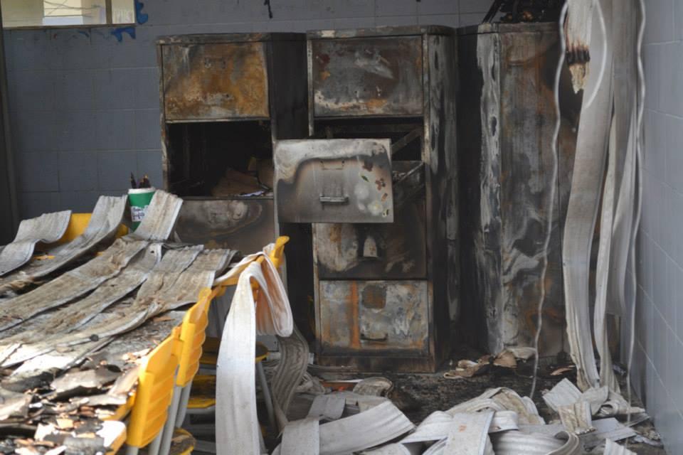 A cena é chocante. Carteiras escolares novas, armários, brinquedos, ventiladores, janelas quebradas e cortinas totalmente destruídas. É difícil acreditar que a sala, tomada pelo incêndio, poderia estar cheia de alunos estudando e que agora ficarão um longo período sem aulas. As cores e o brilho deram lugar ao forte cheiro de fumaça e ao preto pávido dos materiais queimados.