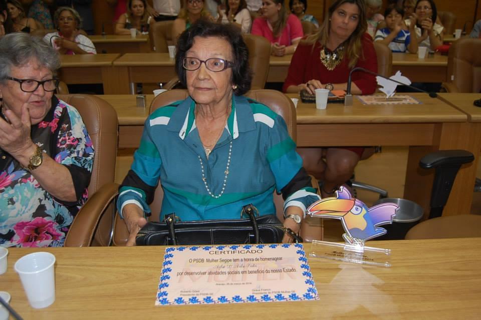 A vice-presidente da Fundação Cultural Cidade de Aracaju (Funcaju), Aglaé Fontes, foi homenageada na tarde de quarta-feira, 26, pelo PSDB Mulher. Na solenidade realizada na Assembleia Legislativa e que contou com a presença da secretária nacional do PSDB Mulher, Sonaly Bastos, e representantes do partido a nível municipal e estadual, dez mulheres foram homenageadas pela sigla partidária, em reconhecimento ao papel social que exercem no Estado.