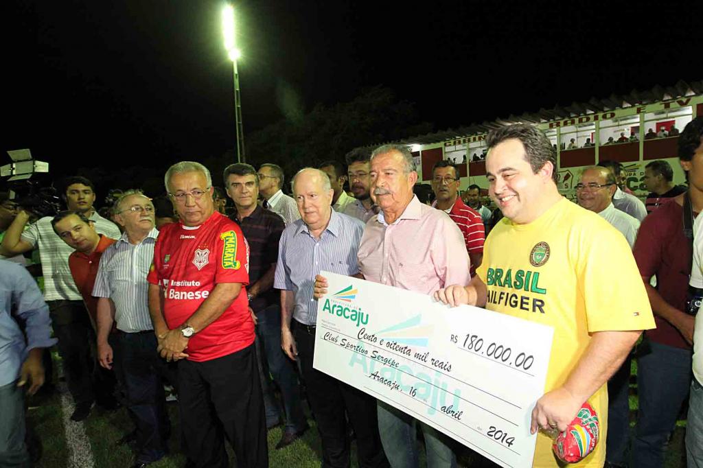 Demonstrando apoio e incentivo ao esporte sergipano profissional, a Prefeitura de Aracaju, através da Secretaria Municipal de Comunicação Social e da Secretaria Municipal da Juventude e do Esporte (Sejesp), realizou a entrega de um cheque simbólico no valor de R$ 180 mil para o Clube Sportivo Sergipe, na noite desta quarta-feira, 16. Durante a solenidade, o Governo do Estado também realizou a entrega do gramado e dos refletores de iluminação do Estádio João Hora.