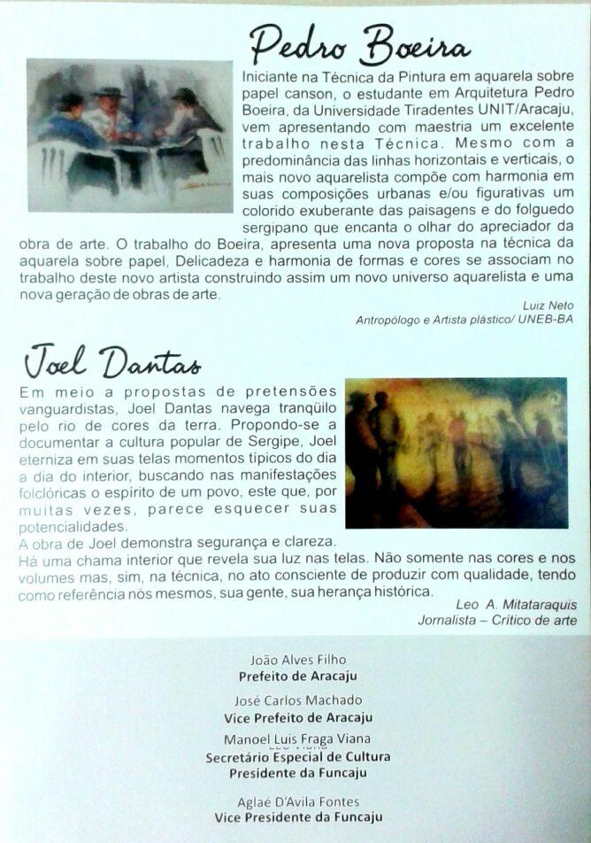 Apaixonado por Sergipe, onde vive desde seus quatro anos de idade, o baiano Joel Dantas busca registrar, através de óleo e acrílico sobre tela, os momentos da Festa do São Pedro de Capela e do São João de Estância, com a festa do mastro e a queima dos fogos dos respectivos municípios.