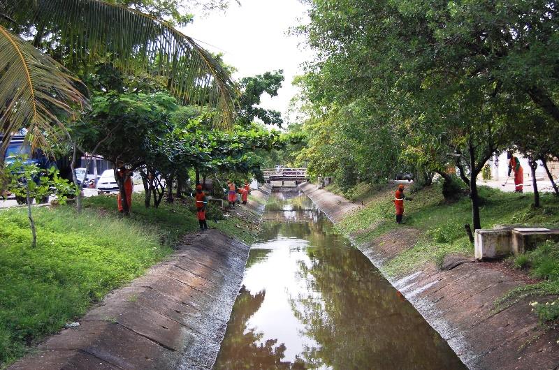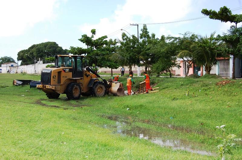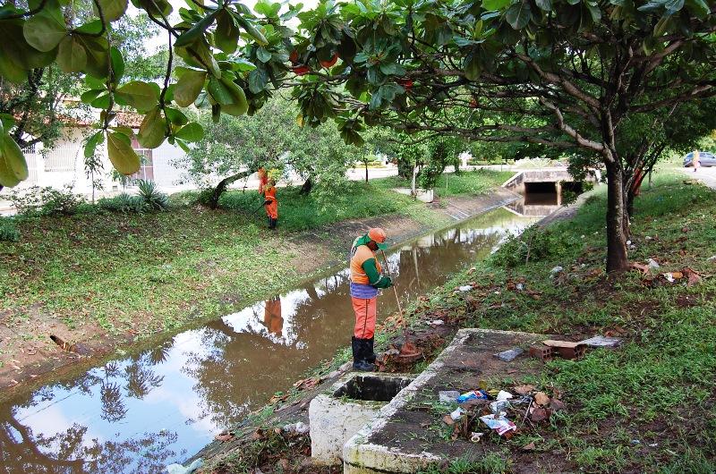 Para manter os canais de água pluvial desobstruídos, três equipes de limpeza atuam na manutenção de córregos no Conjunto Santa Lúcia (Sol Nascente), Av. Filadelfo Dórea (Bairro Industrial), e no Canal Gabiões (Santa Maria).