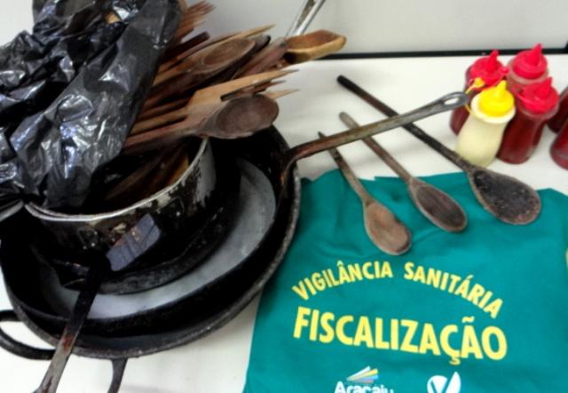 A ação conjunta de fiscalização, promovida pela Vigilância Sanitária de Aracaju e Procon municipal, resultou na apreensão de materiais de cozinha como panelas, colheres de pau e tábuas de cortar carne em visível estado de desgaste e inaptidão para o uso. A situação foi constatada durante este final de semana em bares e restaurantes da Rodovia José Sarney. Os estabelecimentos foram autuados e os proprietários terão prazo de 30 dias para fazer as devidas adequações dos serviços à legislação sanitária.