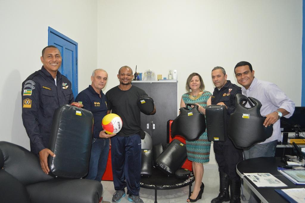 A secretária municipal da defesa social e da cidadania (Semdec), Georlize Teles, o diretor geral da GMA, coronel Enilson Aragão e o diretor adjunto, tenente PM Jonatas Santos entregaram coletes aparadores de chute, aparadores de soco, cama elástica, bola e colchonetes, além de bola feijão, utilizada para o treinamento funcional.