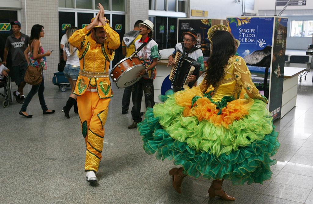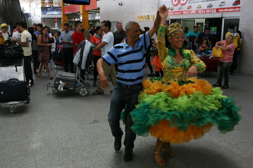 Com muita alegria e criatividade a Secretaria Municipal da Indústria, Comércio e Turismo (Semict) iniciou na tarde desta quarta-feira, 4, a ação que visa recepcionar os turistas no mês junino no aeroporto Santa Maria. Os turistas foram recebidos com o autêntico forró pé-de-serra e um casal de quadrilheiros, que na ocasião o evento serviu para receber a imprensa internacional que irá fazer a cobertura dos treinos da seleção da Grécia.
