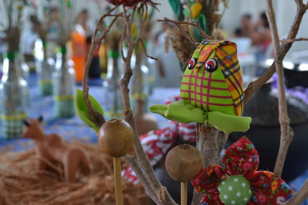 Em um ambiente regado a muita música e comidas típicas, as alunas da instrutora Agda Oliver expuseram peças criativas e coloridas, como arranjos de flores e espantalhos, utilizando como principal matéria-prima, produtos que a maioria das pessoas considera lixo. "Para a decoração junina, trabalhamos com a palha do milho, que serviu para confeccionar as flores dos arranjos, garrafas de vidro, sementes de milhos e retalhos de tecidos para produzir os espantalhos. Este tipo de atividade fortalece nas alunas a importância de preservar o meio ambiente através de um artesanato sustentável", explica Agda.