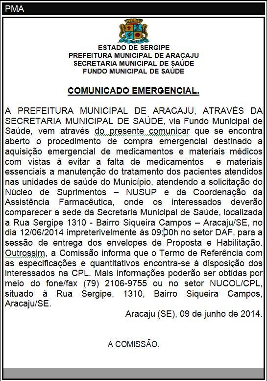 A Secretaria de Saúde de Aracaju abre procedimento para aquisição emergencial de medicamentos e materias médicos, para abastecimento das unidades de saúde da capital.
