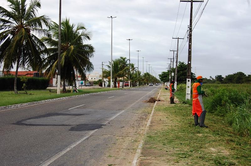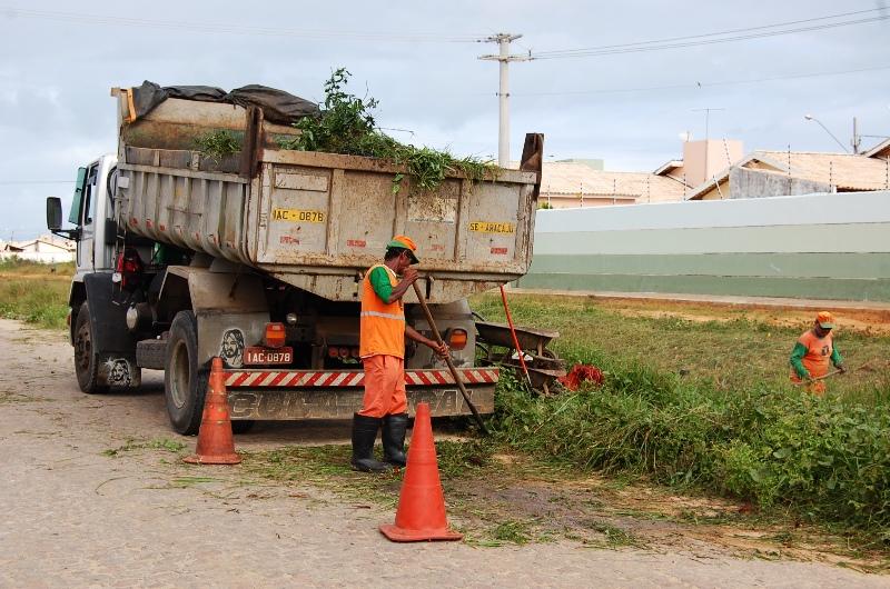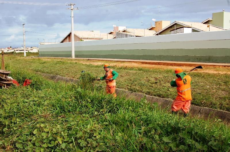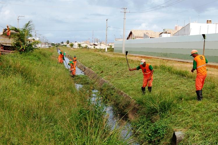 Já na Zona de Expansão, uma equipe de limpeza de canal realiza a desobstrução de mato, lama e lixo no conjunto Brisa Mar. Outro grupo está na Avenida Perimetral, Aruanda, e um terceiro realiza o serviço no conjunto Rosa do Sol, bairro Santos Dumont. Após a roçagem da vegetação do entorno dos canais, todo o resíduo, inclusive lixo e entulho, é retirado pelos agentes, que contam com o apoio de um caminhão tipo caçamba.