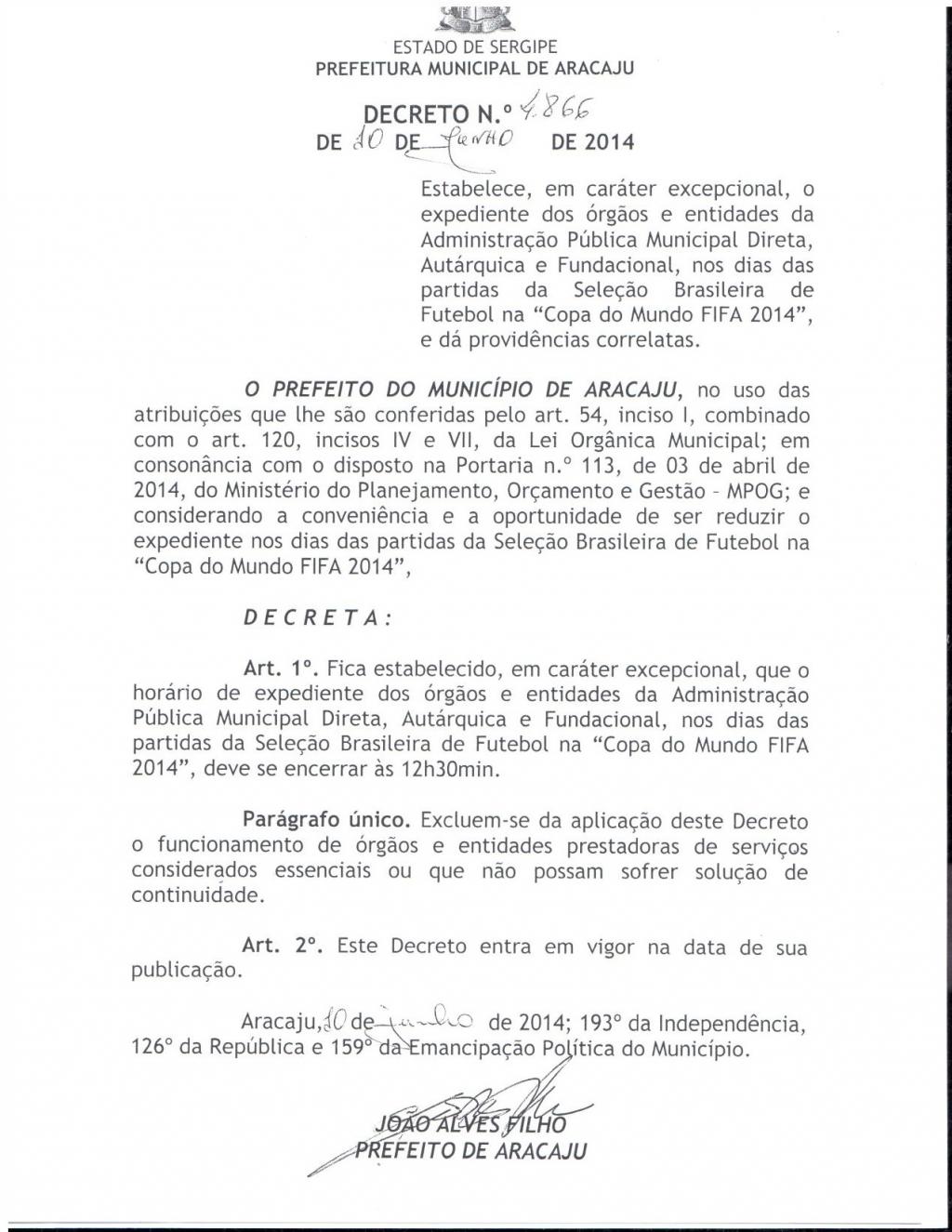O prefeito de Aracaju, João Alves Filho, decretou expediente reduzido nos órgãos e entidades da administração municipal nos dias de jogos do Brasil durante a Copa do Mundo FIFA 2014. Quando houver partidas da seleção brasileira, o expediente será somente até as 12h30.