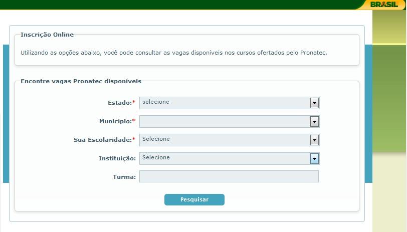Após clicar no curso selecionado, o futuro aluno terá informações a respeito da carga horária, do turno e da instituição ofertante. Também serão disponibilizados espaços para preencher o número do CPF, a data de nascimento, o endereço de e-mail e o número de telefone para contato. Depois do preenchimento, deve-se imprimir a folha de inscrição e destinar-se a instituição ofertante, na data descrita, para confirmar a inscrição. A vaga do aluno só é garantida depois da confirmação da inscrição.